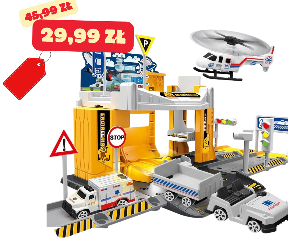 Mega Zestaw 4w1 – Garaż, Lotnisko, Parking i Tory! ✈️ Stwórz własny świat samochodów i pojazdów ratunkowych! Nie przegap!