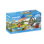 Lato, słońce i wodna zabawa! Mama wraz z synem cieszą się słoneczną pogodą. Mama relaksując się obserwuje jak mały chłopiec pluska się w basenie, a mały ciekawski kot przygląda mu się uważnie. Zarówno przed opalaniem oraz po wyjściu z wody ważne jest regularne stosowanie kremu przeciwsłonecznego! Na szczęście zawsze jest on pod ręką. Efekt oparzeń słonecznych: figurka kobiety czerwienieje pod wpływem promieniowania UV. Wyjątkowe Starter Packs PLAYMOBIL zachęcają dzieci do odkrywania różnorodnych światów tematycznych PLAYMOBIL. Zestawy zawierają figurki wraz z odpowiednimi akcesoriami, które można złożyć w mgnieniu oka i rozpocząć zabawę. Ochrona środowiska: zestaw do zabawy składa się średnio w ponad 80% z materiałów ekologicznych, czyli materiałów pochodzących z recyklingu i tworzyw sztucznych pochodzenia biologicznego.