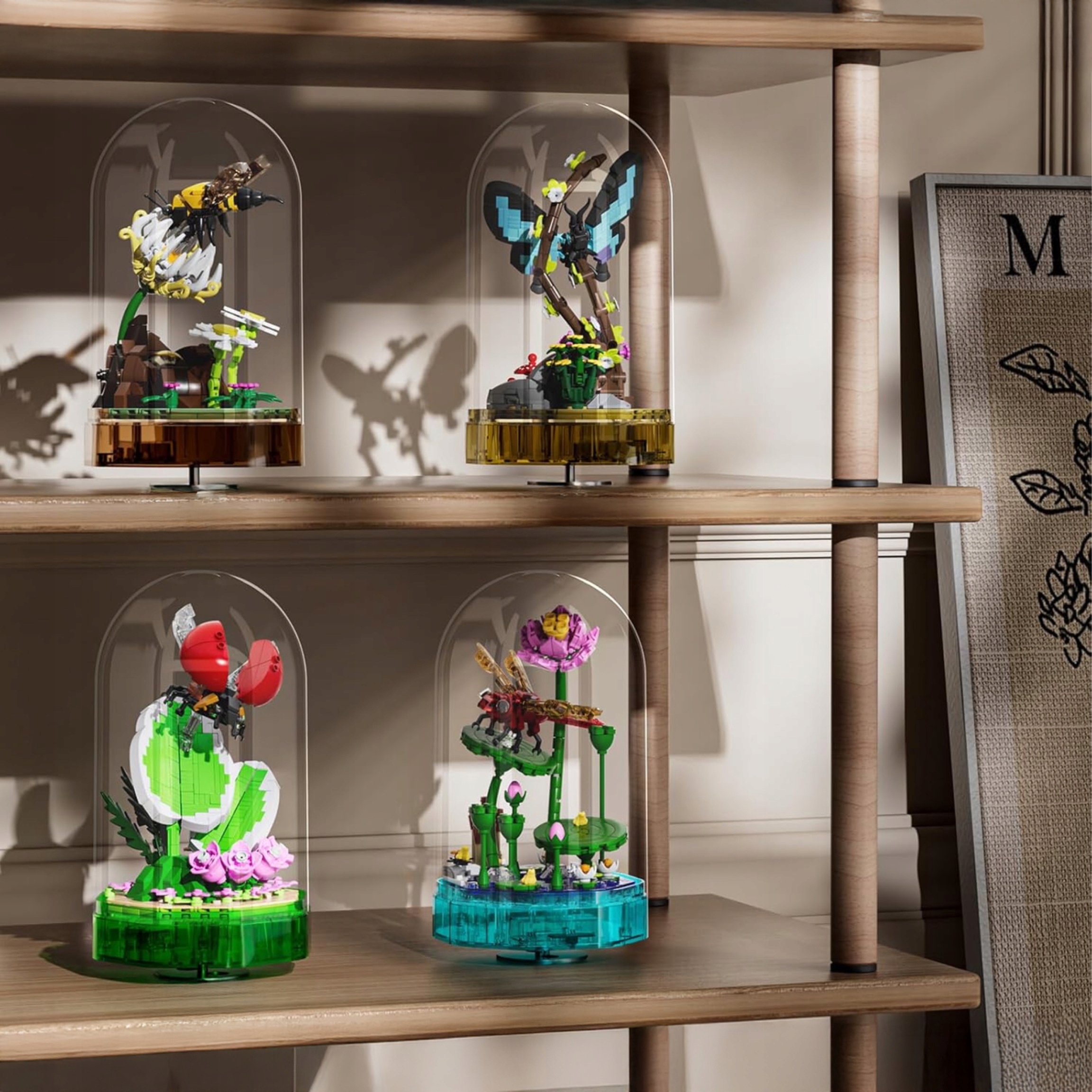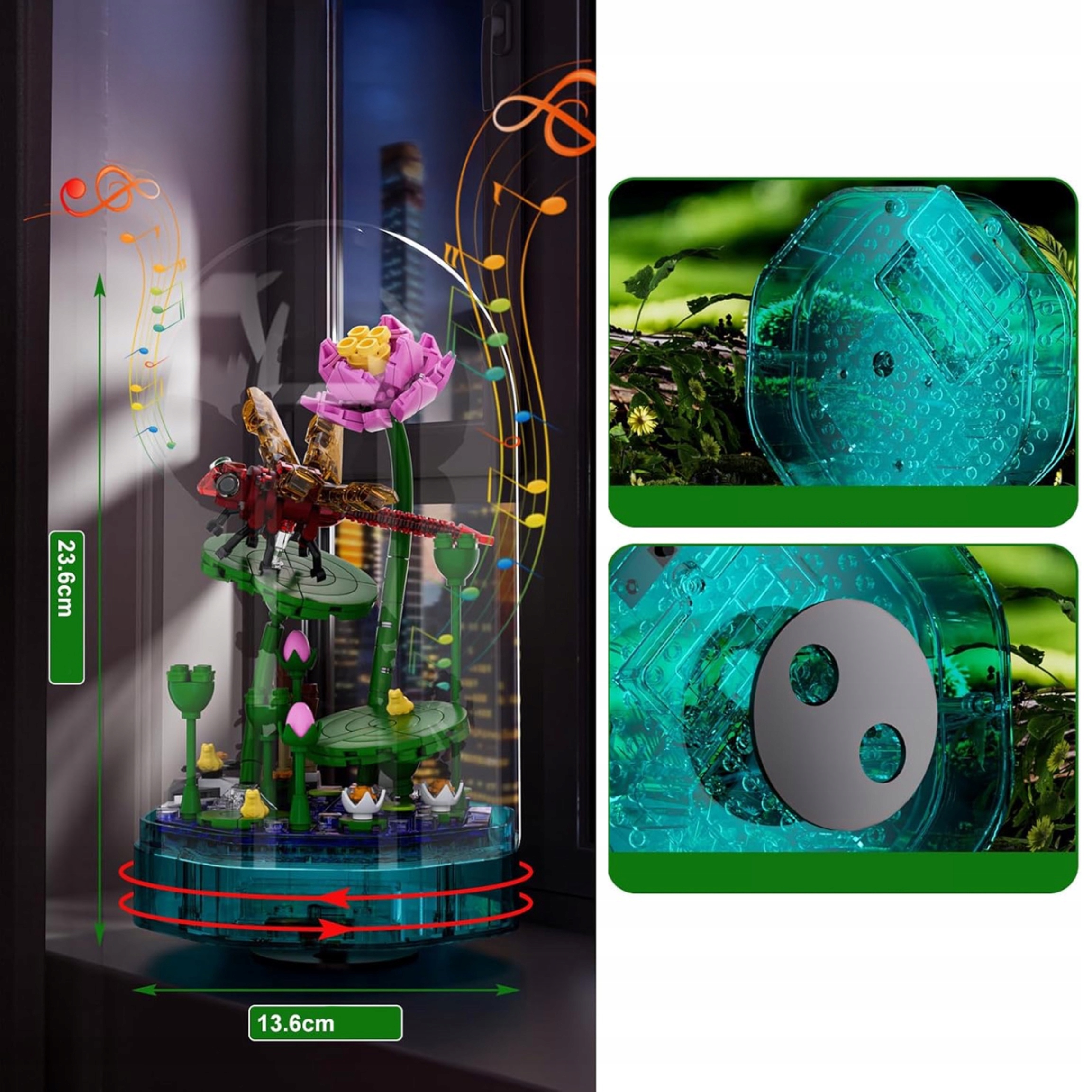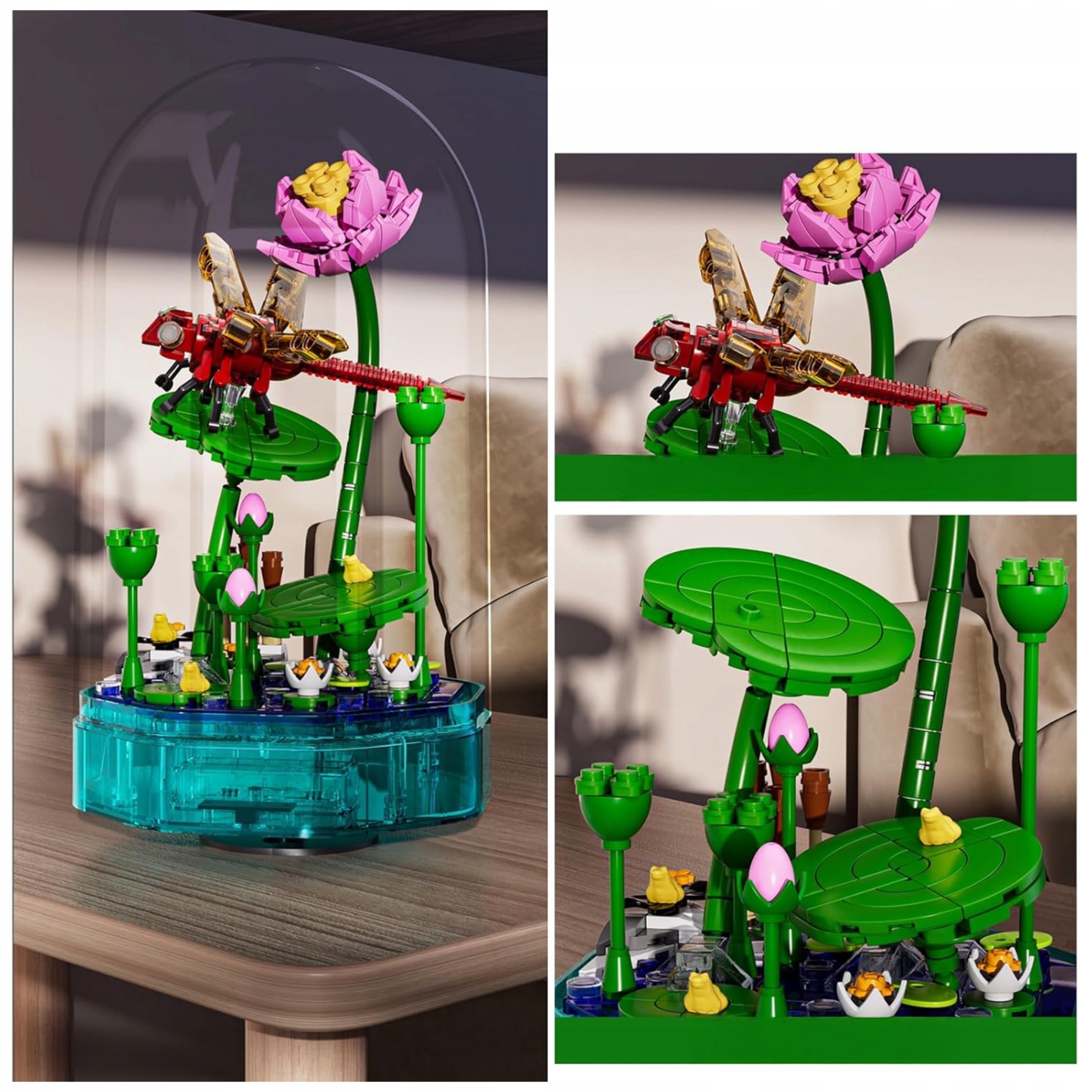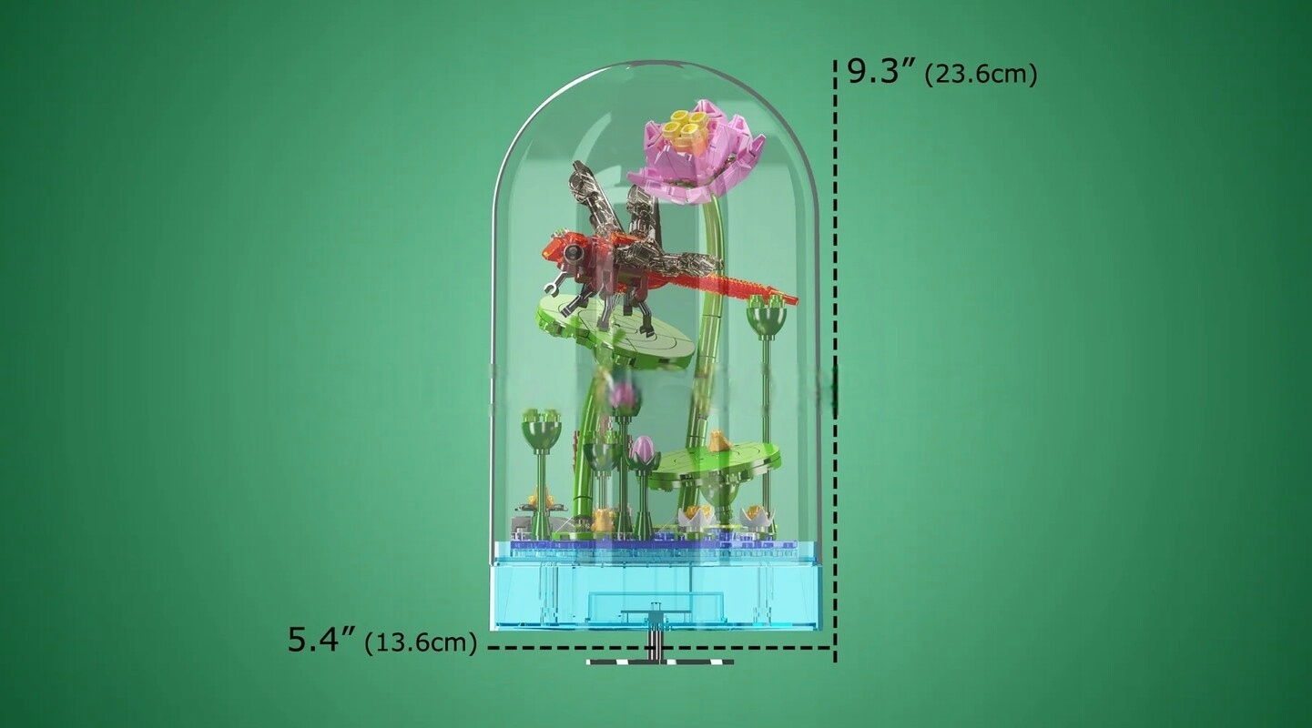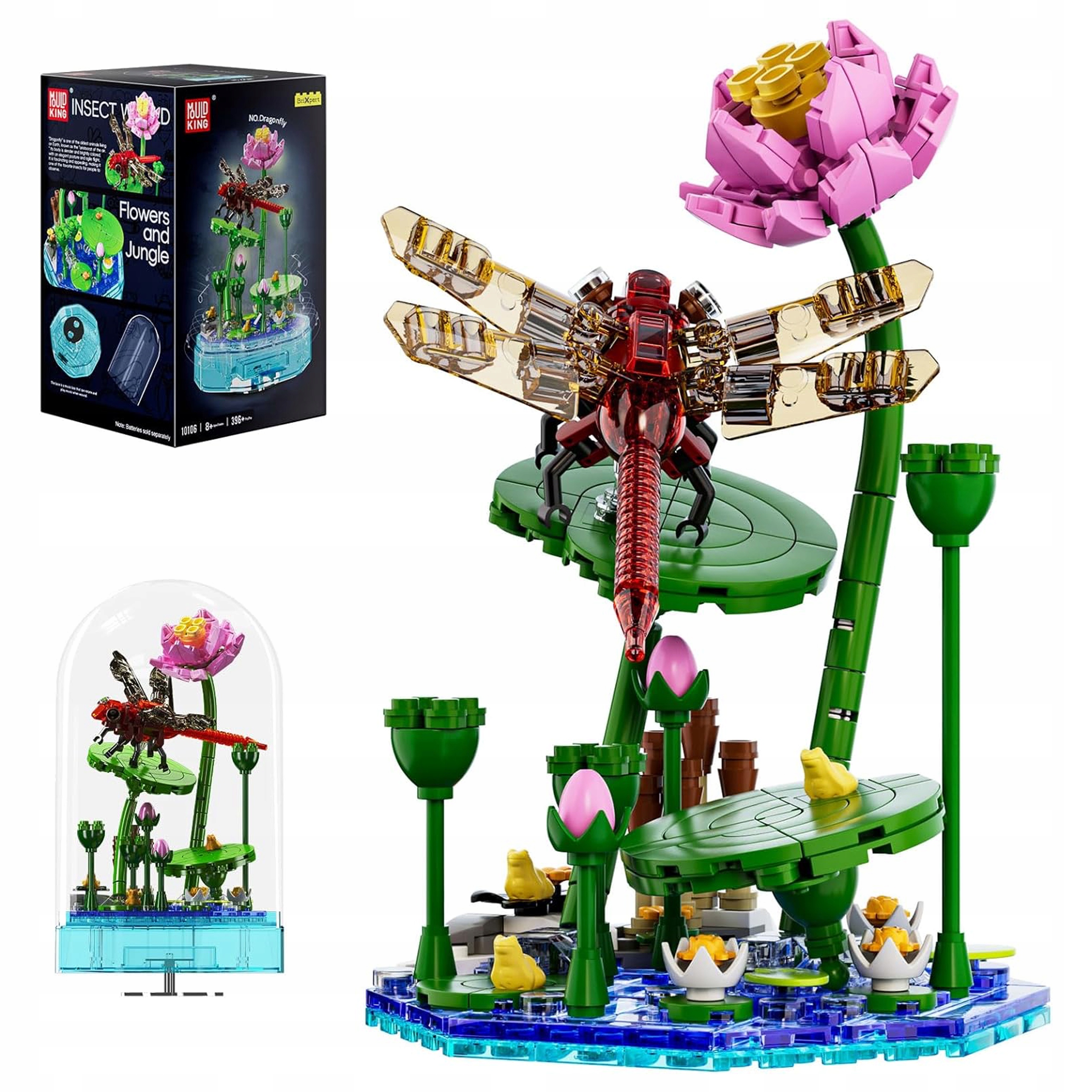 pozytywka z ważką, Mould King 10106, świecąca dekoracja z klocków, zestaw kreatywny 8+, ważka na liściu, pozytywka LED z melodią, dekoracja przyrodnicza, zestaw z kopułą, klocki dla dzieci i dorosłych, prezent dla miłośników natury