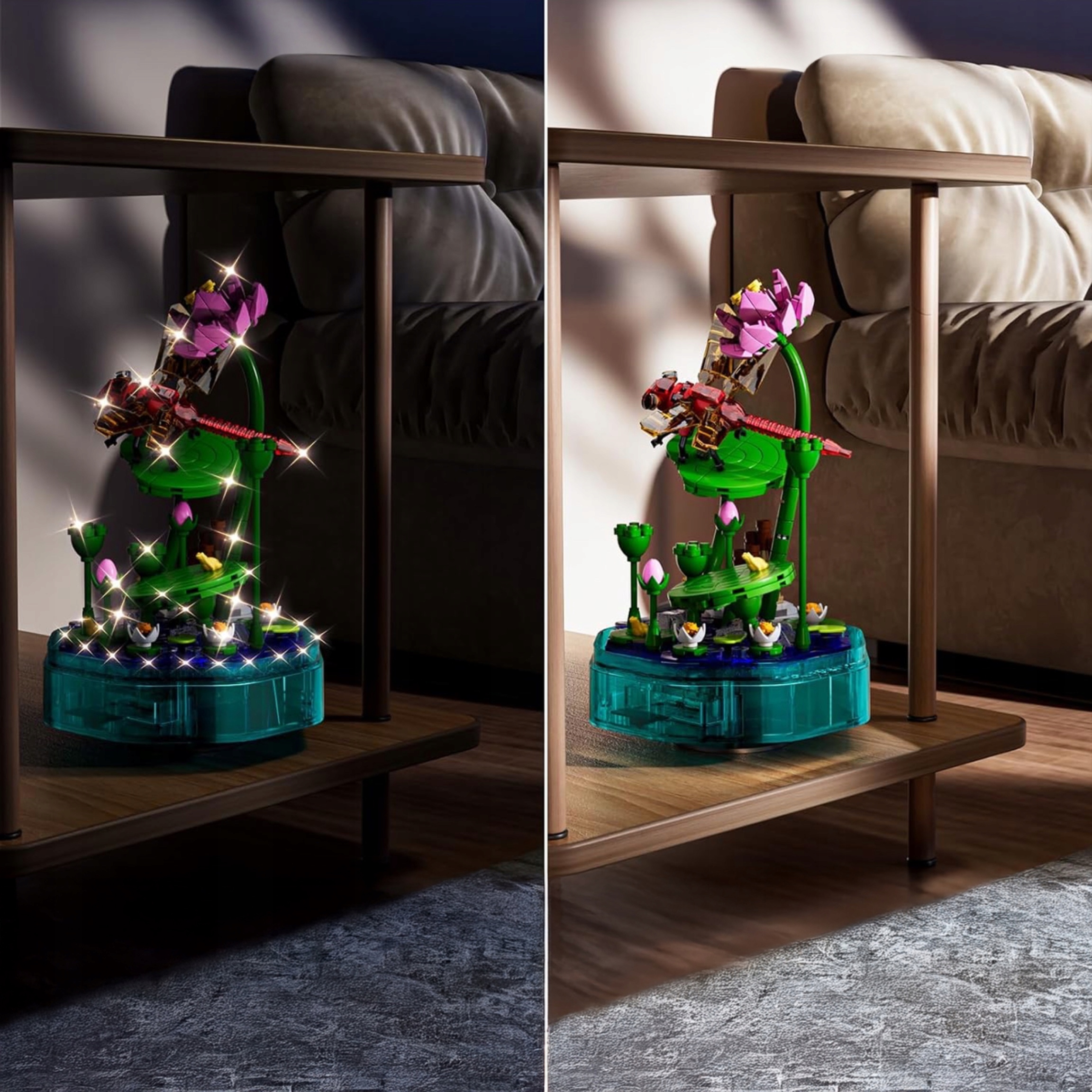 Pozytywka z Ważką – Mould King 10106 LED z Melodią, Dekoracyjny Zestaw Klocków z Liściem i Kopułą