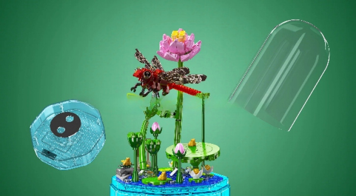 To zestaw klocków, z których zbudujesz pozytywkę z ważką. Po złożeniu, pozytywka gra melodię i świeci, tworząc piękną scenę z ważką na liściu.
