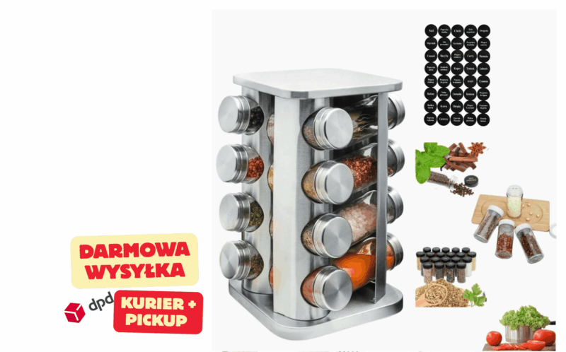 Obrotowy stojak na przyprawy – 16 słoiczków po 100 ml + 40 naklejek GRATIS!